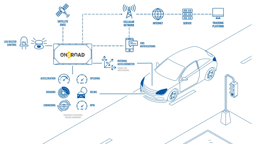 - Monitoriza de manera constante parámetros como posición, velocidad, acelerómetro, estado (en marcha o apagado)…